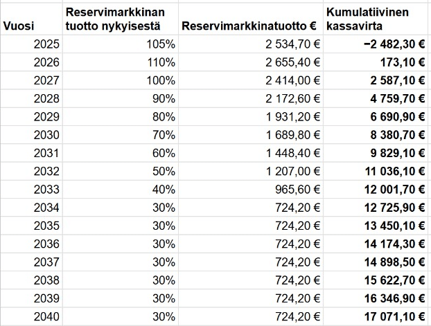 - Reservimarkkinakorvaukset vuodessa: 28,73€*10,80kW*12kk*0,7 = 2 606,38€