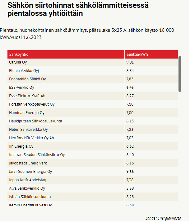 Sähkön siirtohinta muodostaa todella suuren osan kokonaisuudesta, esim Caruna Oy (Pientalo, huonekohtainen sähkölämmitys, pääsulake 3×25 A, sähkön käyttö 18 000 kWh/vuosi 1.6.2023) maksaa siirto 9,01 senttiä/kWh