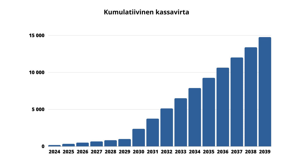 Toisin sanoen, näillä parametreilla voimala on kassavirtapositiivinen, siihen ei sitoudu omaa pääomaa ja maksut on maksettu 6:ssa vuodessa. Heti kun järjestelmää tarkastellaan hieman pidemmällä aikajänteellä, huomataan, että hankinta muodostuu todella kannattavaksi. Esimerkiksi 10 vuoden kohdalla kumulatiivinen kassavirta on lähes 7900€ voitolla ja 15 vuoden kohdalla ollaan jo melkein 15000€ voitolla. Aika hyvin täysin velkavivulla toteutettulla sijoituksella!