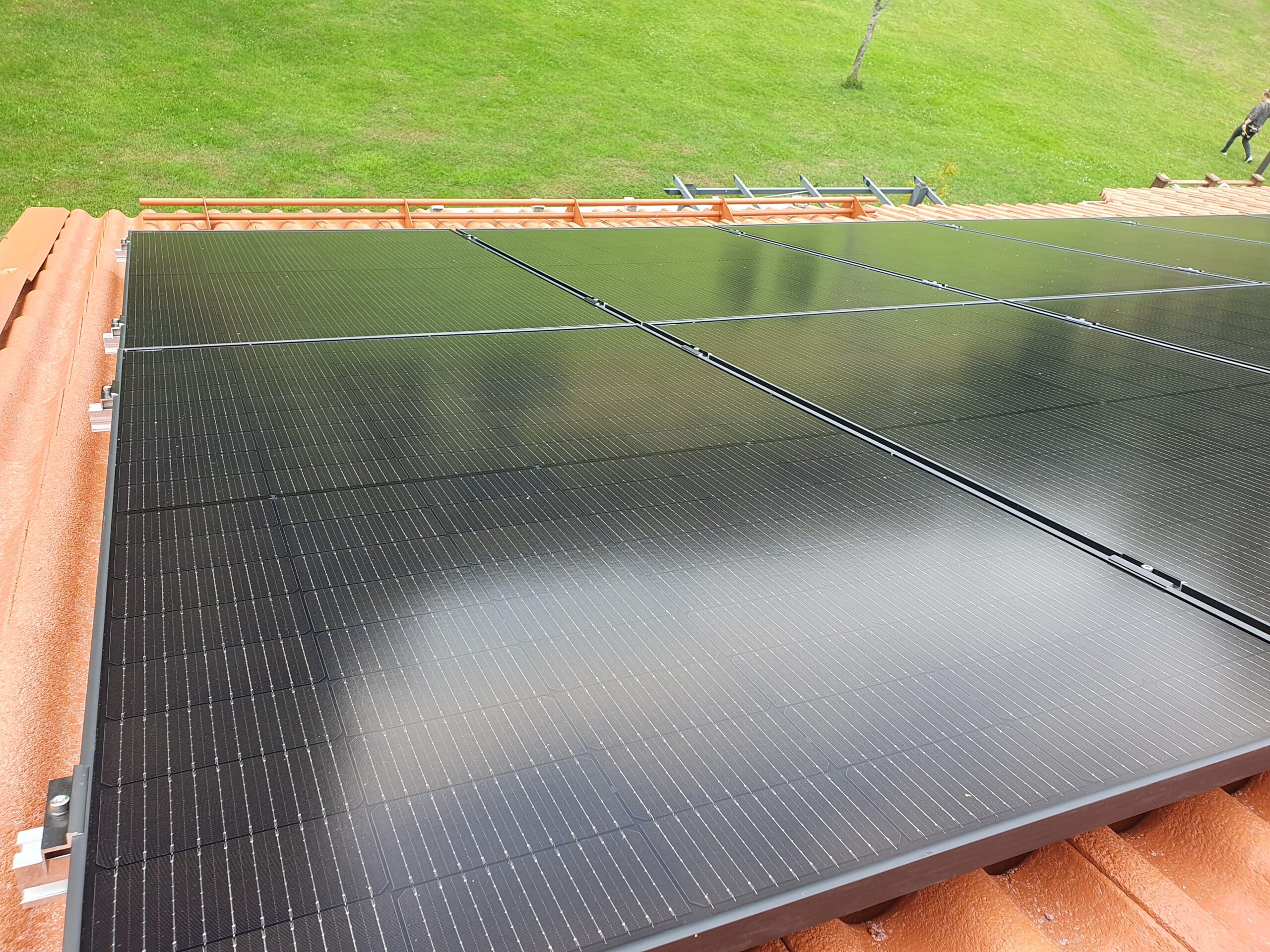 HT-SAAE 400W täysmustat lasi-lasi paneelit asennettuna omakotitalon katolle.